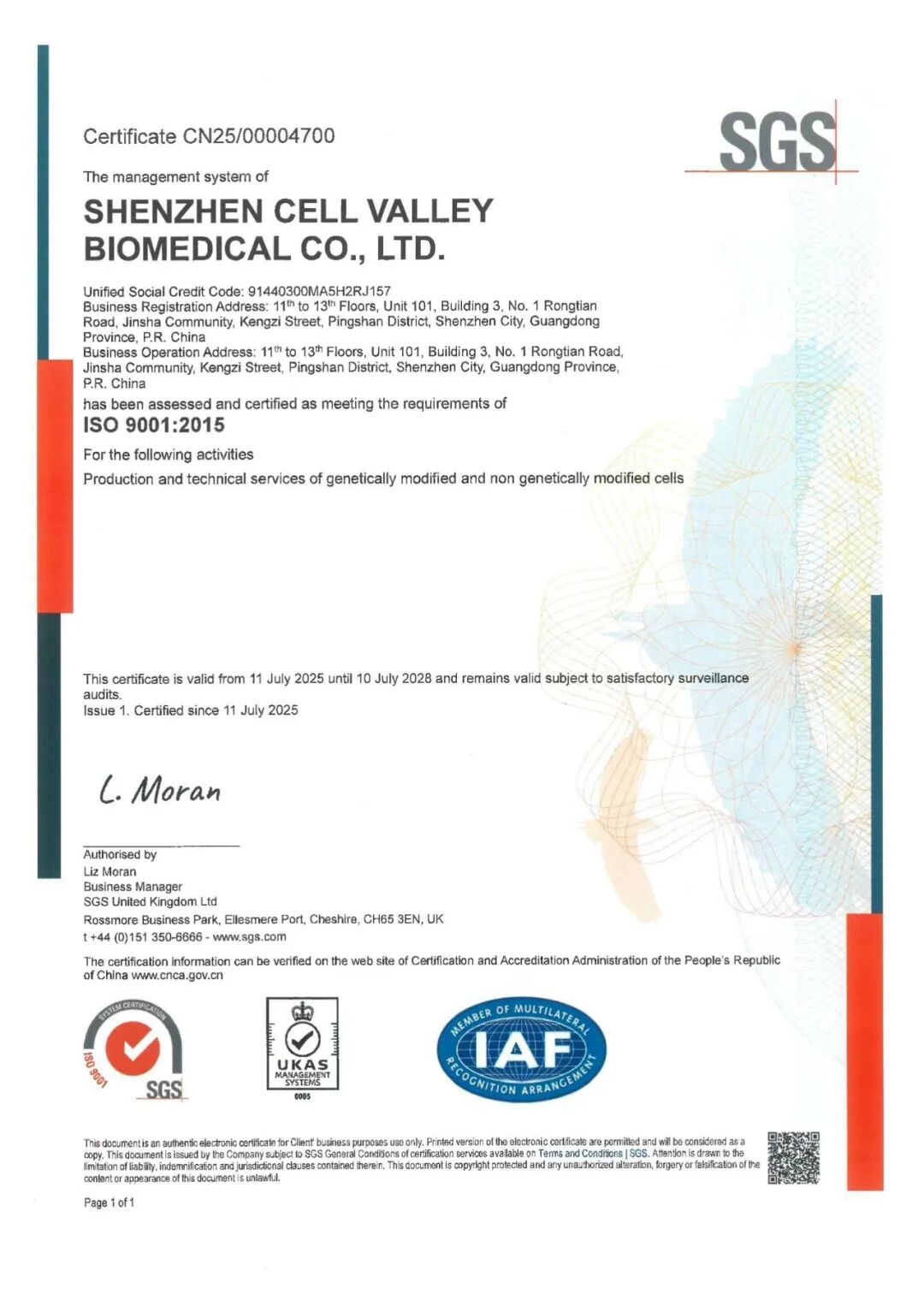 2025年7月11日,经国际权威认证组织SGS严格评审,深圳evo真人视讯生物医药有限公司正式取得ISO 9001:2015质量管理体系认证证书,认证范围覆盖基因修饰及非基因修饰细胞生产与技术服务。