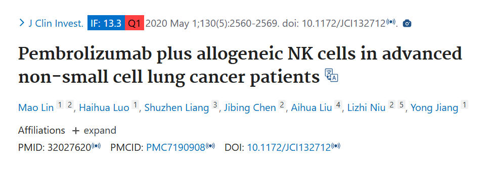 [3] Lin M, Luo H, Liang S, et al.  Pembrolizumab plus allogeneic NK cells in advanced non-small cell lung cancer patients. J Clin Invest. 2020 May 1;130(5):2560-2569.